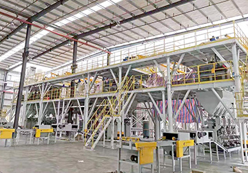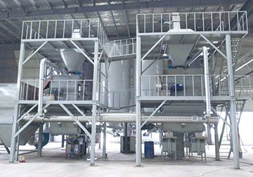 石膏砂漿生產線主要由儲料系統、物料輸送系統、自動配料系統、高效無重力混合系統、新型收塵系統、空氣動力系統、自動包裝系統、自動控制系統、優質鋼架平臺等構成。