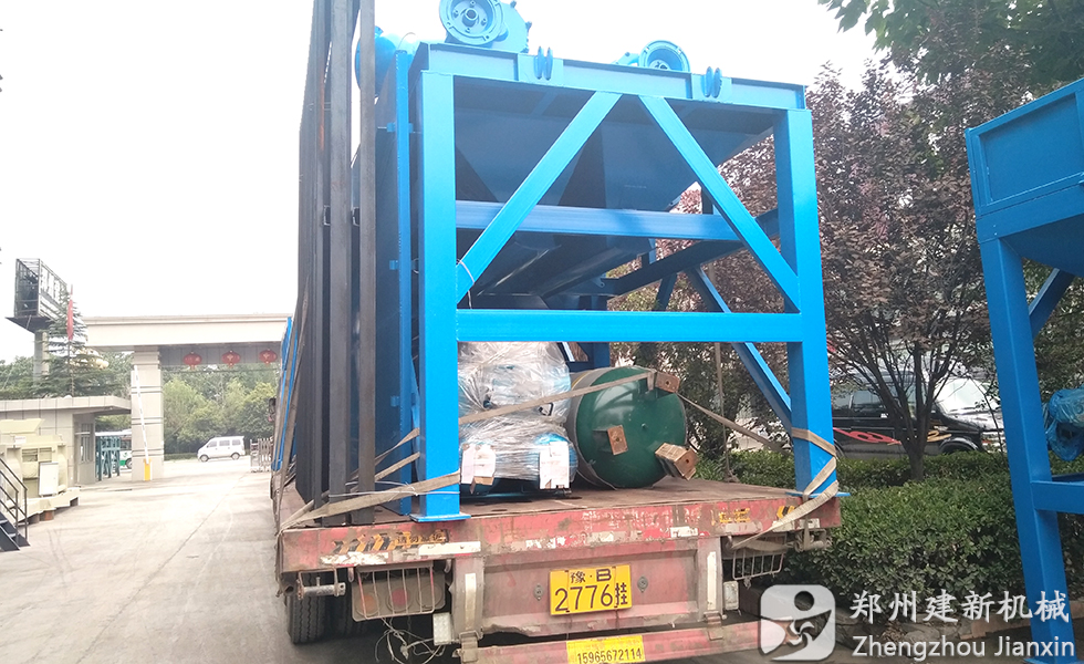 9月14日,一套建新HZS75攪拌站設備在廠家裝車完畢,等待運往甘肅省。圖為運輸車輛在建新機械廠區門口等待出發。
